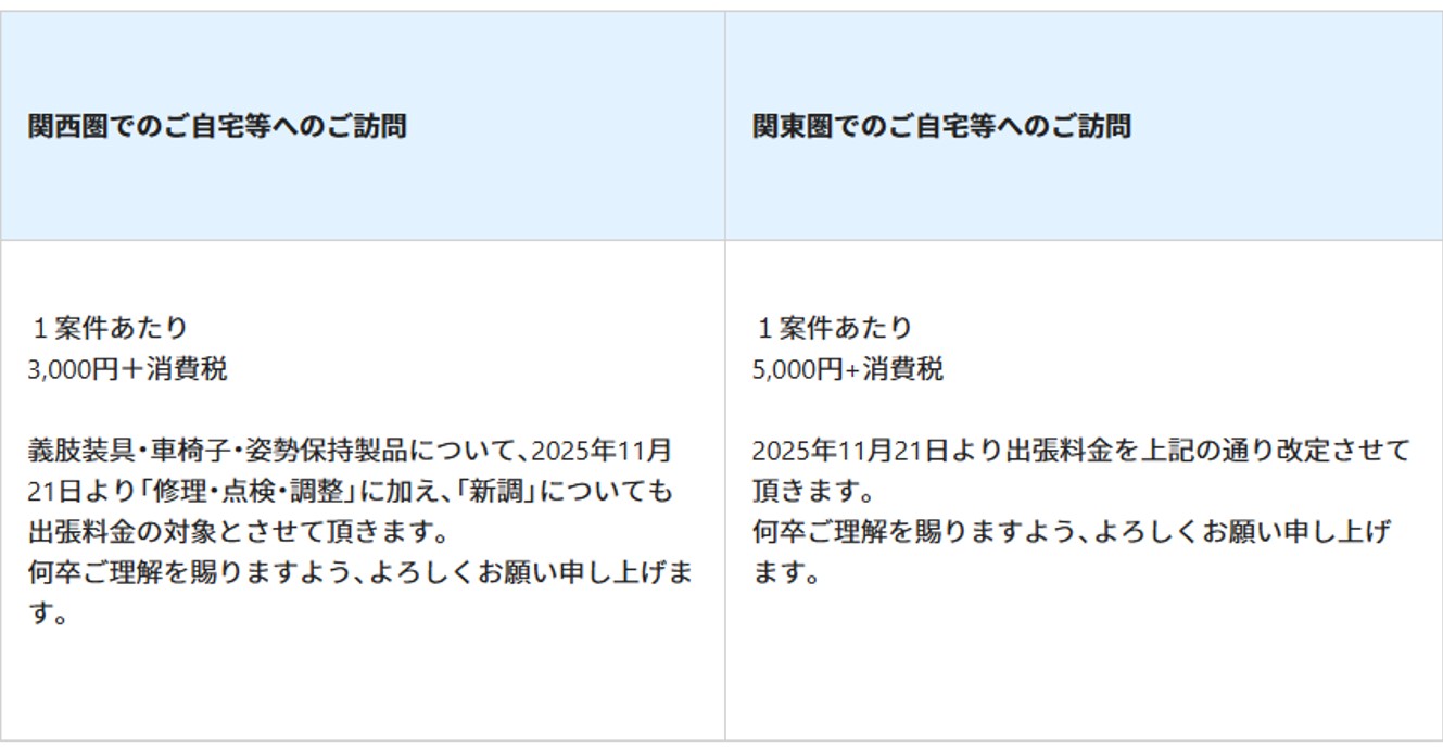 弊社では、製品の新調や修理について、ご自宅等での対応をご希望の場合、出張料を頂戴しております。