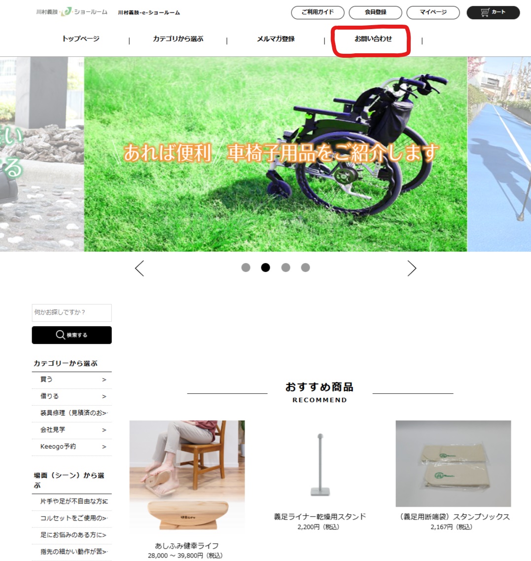 ②メール相談:川村義肢-e-ショールーム内 の お問合せフォーム から問合せができます。