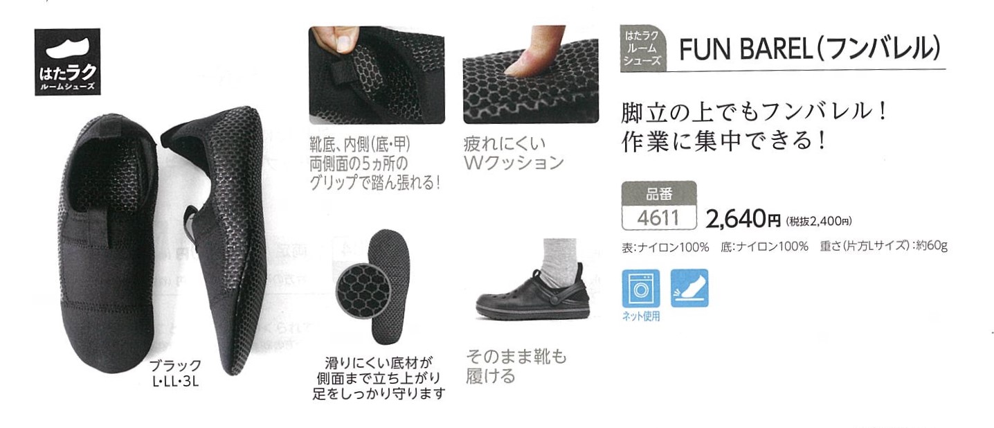 この″フンバレル″ 靴底、内側(底・甲)、両側面の5ヵ所のグリップで、滑りにくくブレにくく、作業に集中できるということがお勧めポイント。